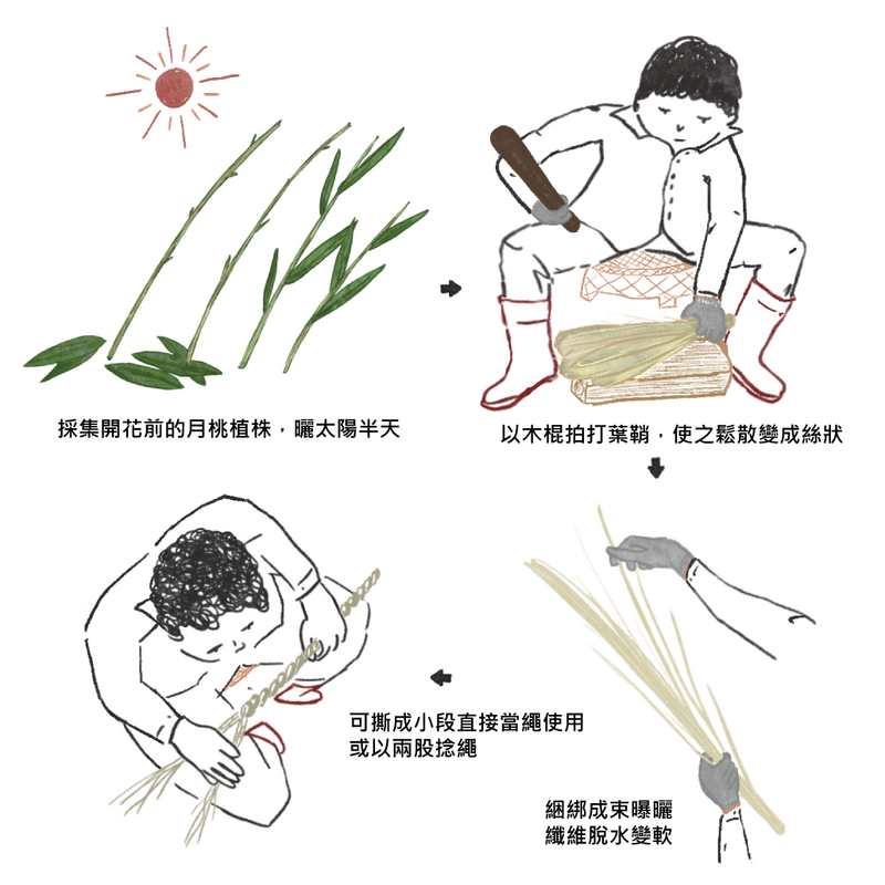 1、學習月桃葉鞘採集到製作月桃繩的流程