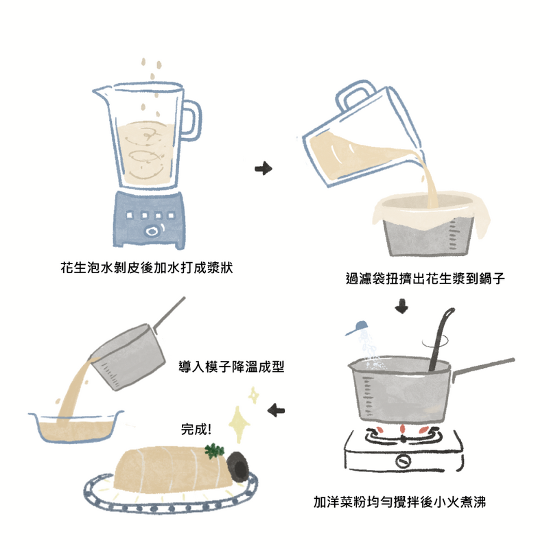 生花生泡水剝皮加水用果汁機打成漿,過濾花生渣後,將花生汁加入洋菜粉均勻攪拌,用小火煮沸讓洋菜粉溶解,倒入模子降溫成型,放入冰箱加速凝固,脫模切塊即可品嘗。