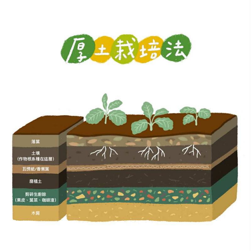 當土壤缺乏有機質、太硬或貧瘠時,可透過厚土種植法改善地利,