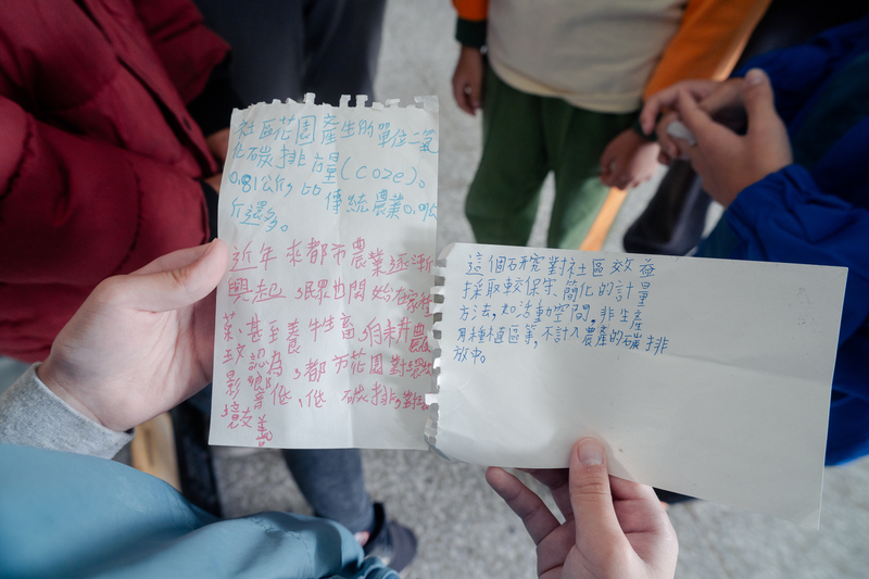 △ 花蓮縣吉安鄉化仁國小神農計畫課程:學生將小組討論議題論點記錄下來